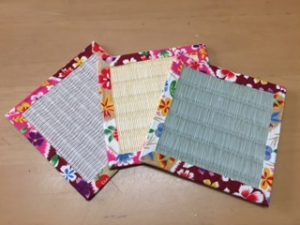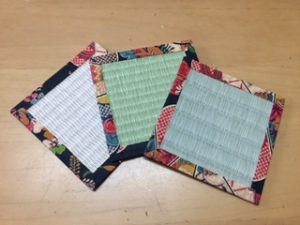おしゃれな畳コースター シックな和の生地が手に入ったので、新柄の畳コースターを作成しました。 畳表は、天然いぐさ100%(熊本産)のものと、和紙を加工した表(ダイケン銀箔・清流・清流カクテルフィットなど)とがあります。 天然いぐさものは、香りが良いのがおすすめですが、濡れるとしみが残りやすいのに比べて、 和紙のものは、香りが無い反面、撥水性があるので冷たい飲み物等にはおすすめです。 新作物は、へりに使用している生地が従来物よりもやや高価なため、1枚¥200となります。 ご了承ください。 以前 これからの畳 最近 置き畳・カラー畳